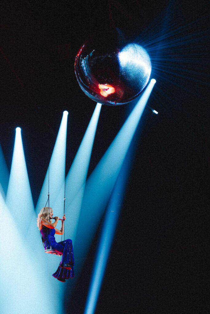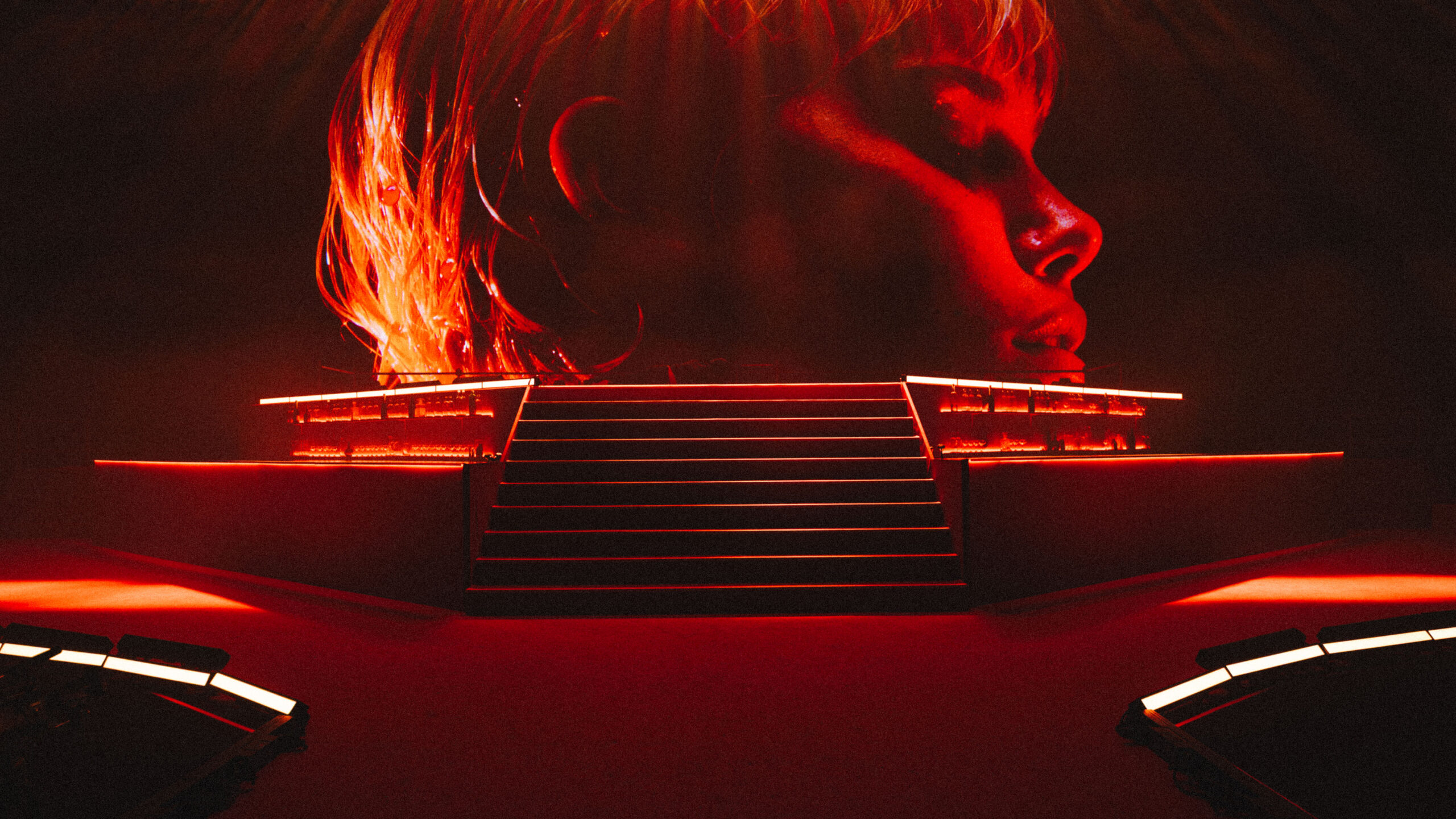 Kinetic Architecture. To ground the digital chaos, we needed physical weight. We engineered a massive, suspended kinetic monolith—a "planet" that descended from the rig. Dara began the show suspended in the air, defying gravity. This wasn't just a stage; it was a machine designed to merge the biological star with the synthetic environment.