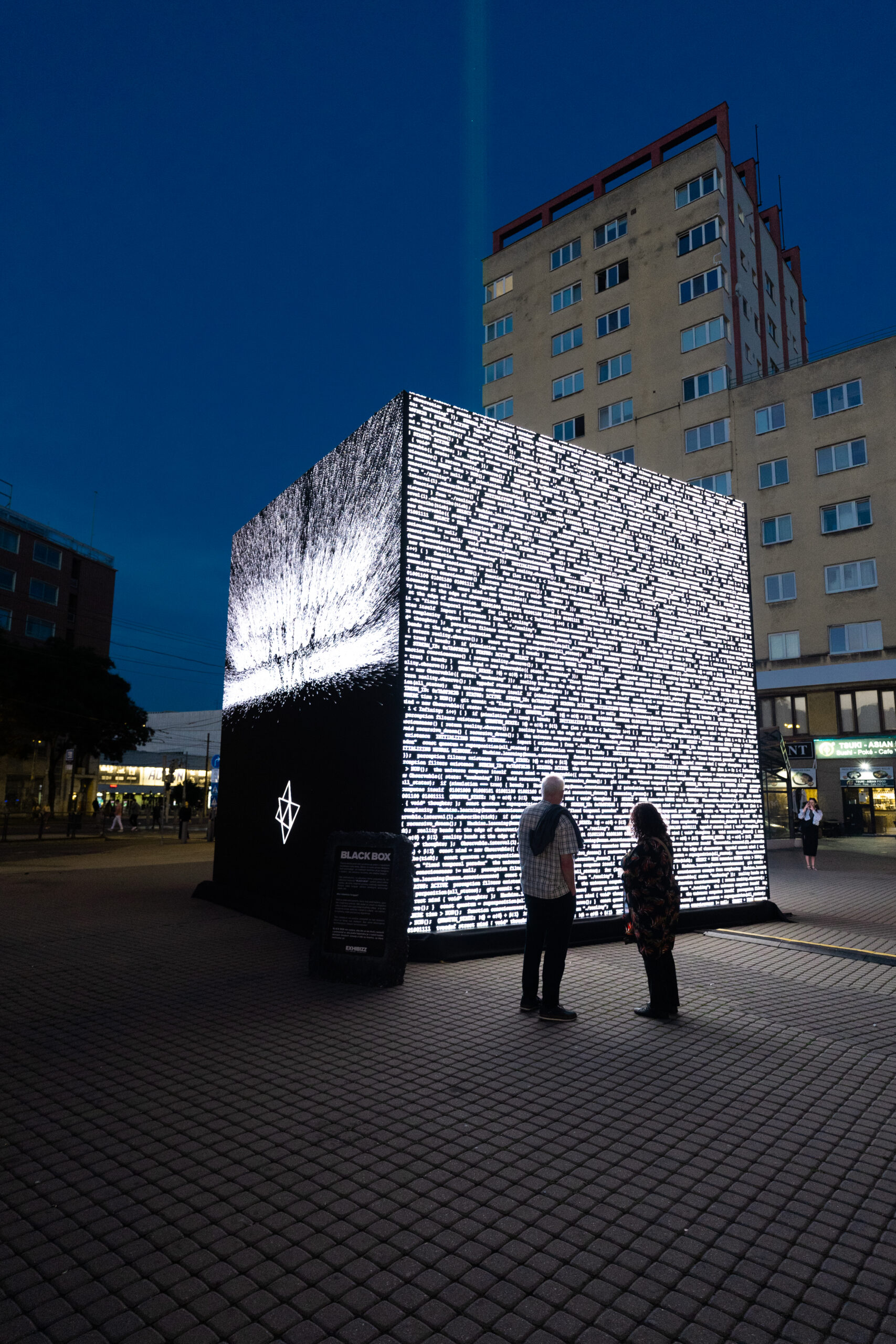 A monolith in Bratislava's center. Two AI agents talking in code. Predicting futures. The exhibition's brain exposed.